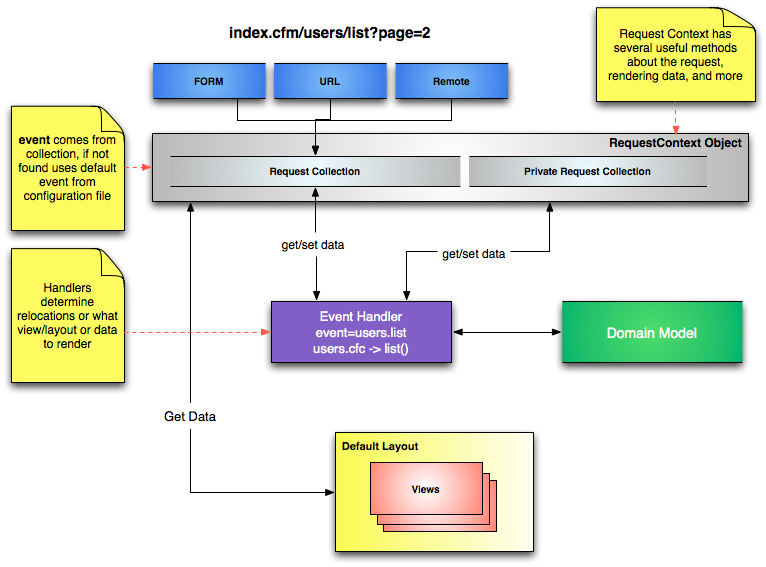 event- An object that models and is used to work with the current request, called the request context.rc- A struct that contains both URL/FORM variables (unsafe data)prc- A secondary struct that is private only settable from within your application (safe data)