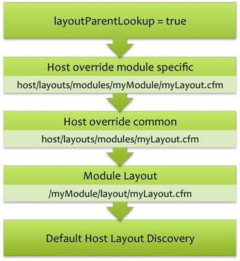 layoutParentLookup = false 1. Module layout (e.g. /modules/myModule/layouts/myLayouts.cfm) 2. Host override module specific (e.g. {HOST}/layouts/modules/myModule/myLayout.cfm) 3. Host override common (e.g. {HOST}/layouts/modules/myLayout.cfm) 4. Default layout discovery from host (e.g. {HOST}/layouts/Default.cfm)