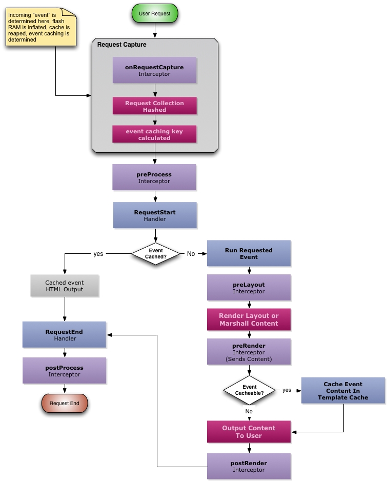 For example, you have an event called blog.showEntry. This event executes, gets an entry from the database and sets a view to be rendered. The framework then renders the view and if event caching is turned on for this event, the framework will cache the HTML produced. So the next incoming show entry event will just spit out the cached HTML. The cache key is created by hashing the incoming request collection.