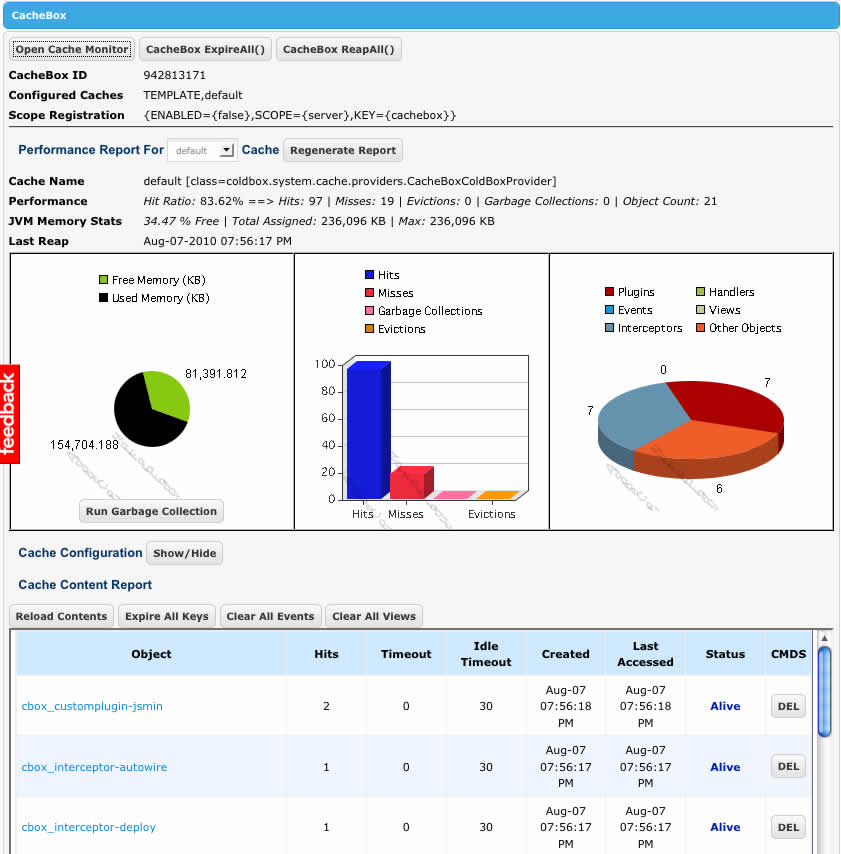 CacheBox has an intuitive and powerful monitor that can be used via the ColdBox Debugger Module. From the monitor you can purge, expire and view cache elements, etc.