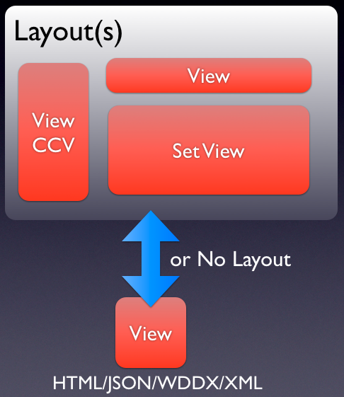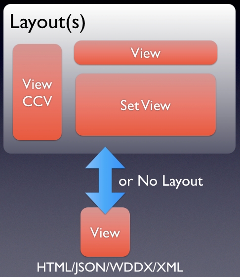 You can have as many layouts as you need in your application and they are super easy to override or assign to different parts of your application. Imagine switching content from a normal HTML layout to a PDF or mobile layout with one line of code. How cool would that be? Well, it's that cool with ColdBox. Another big benefit of layouts, is that you can see the whole picture of the layout, not the usual cfmodule calls where tables are broken, or divs are left open as the module wraps itself around content. The layout is a complete html document and you basically describe where views will be rendered. Much easier to build and simpler to maintain.