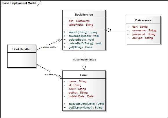I recommend you model these class relationships in UML class diagrams to get a better feeling of the design. Anyways, that's it, we are doing domain modeling. We have defined a domain object called Book and a companion BookService object that will handle book operations.